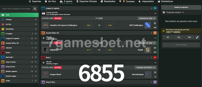 O 6855 oferece uma grande seleção de opções de apostas em e-sports com probabilidades competitivas